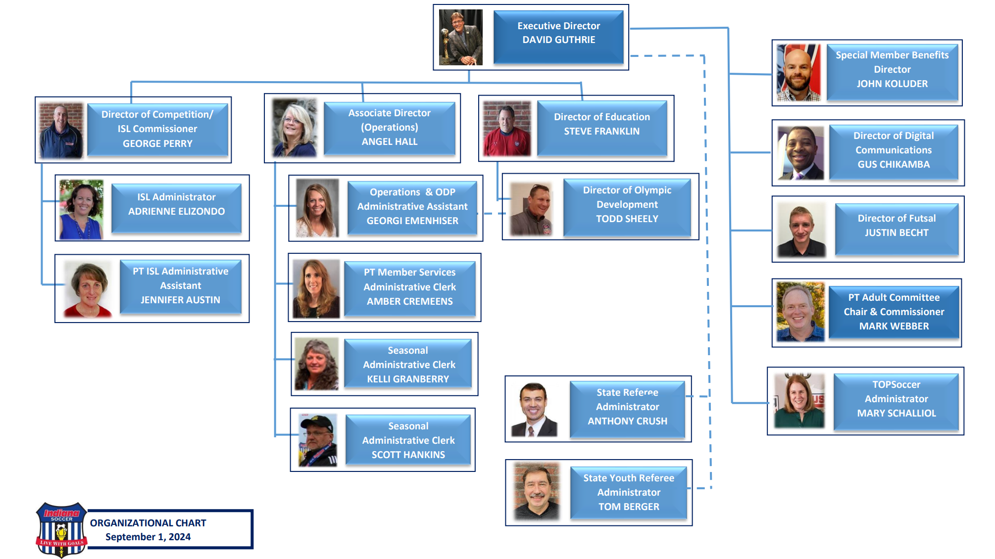 Indiana Soccer is organized to provide nonprofit, public, educational soccer development and competition. Its leadership is comprised of an Executive Committee and a volunteer Board of Directors who represent all parts of the state. The organization currently has a professional staff of 10 full-time employees and several part time employees. The main office is located in Westfield, Indiana, at Grand Park.