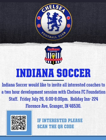 Indiana Soccer is excited to announce the Chelsea Football Club Foundation coaching event coming to Granger, Indiana on Friday, July 26th, 2024. Members of the Chelsea FC Foundation will facilitate a two-hour in-person development session starting at 6 pm Eastern time at the Holiday Inn, Granger, IN. The event is open to all interested coaches and attendance is FREE. You will be required to complete registration before the event by completing the form below.