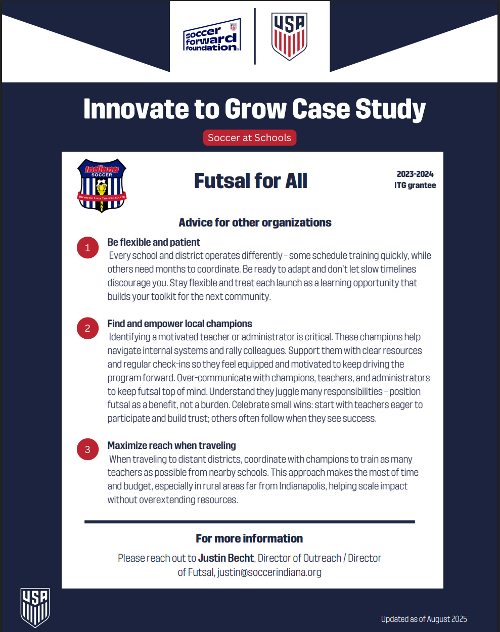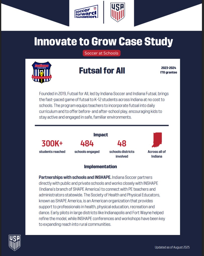 Founded in 2019, Futsalfor All, led by Indiana Soccer and Indiana Futsal, brings the fast-paced game offutsalto K–12 students across Indiana at no cost to schools. The program equips teachers to incorporate futsal into daily curriculum and to offer before- and after-school play, encouraging kids to