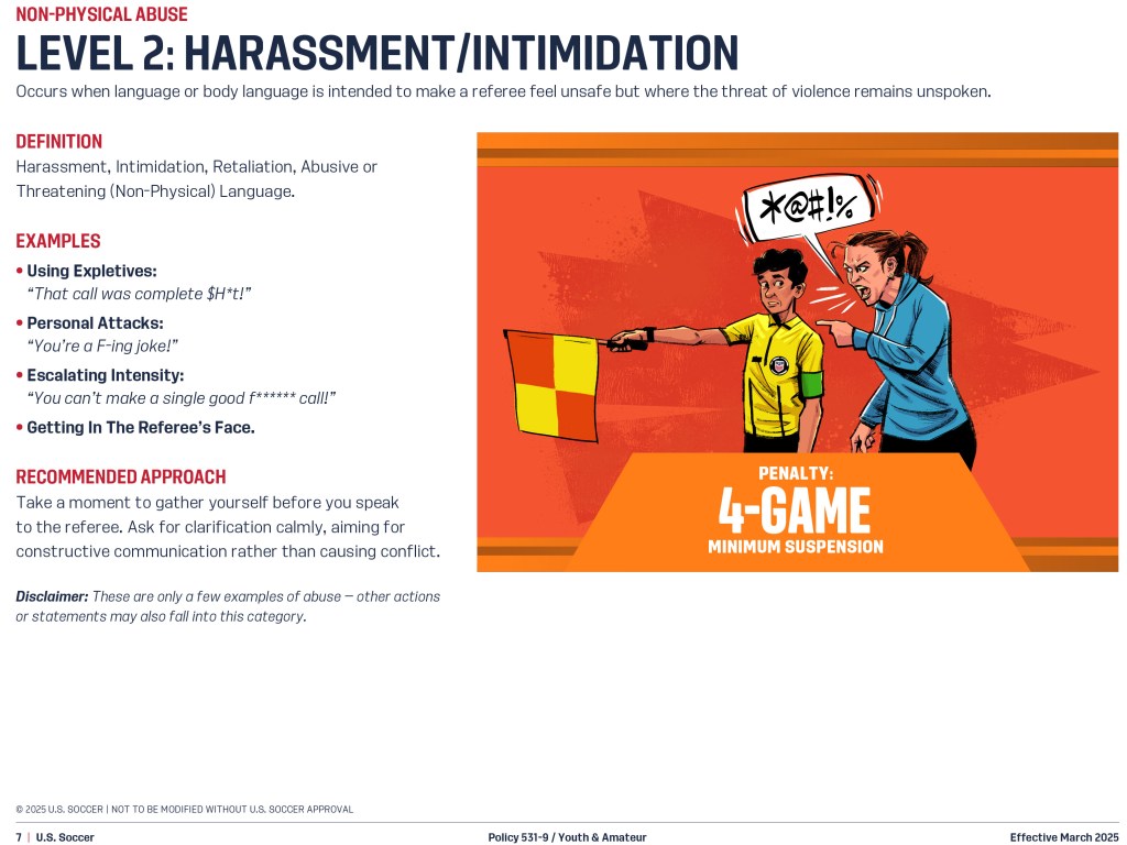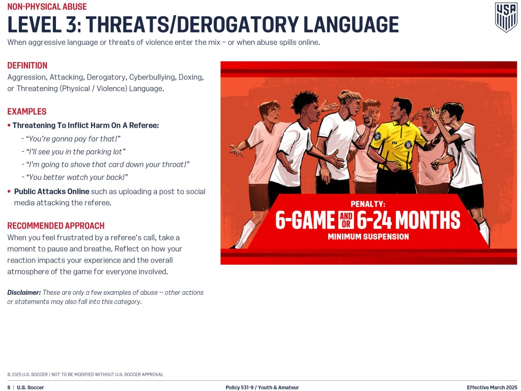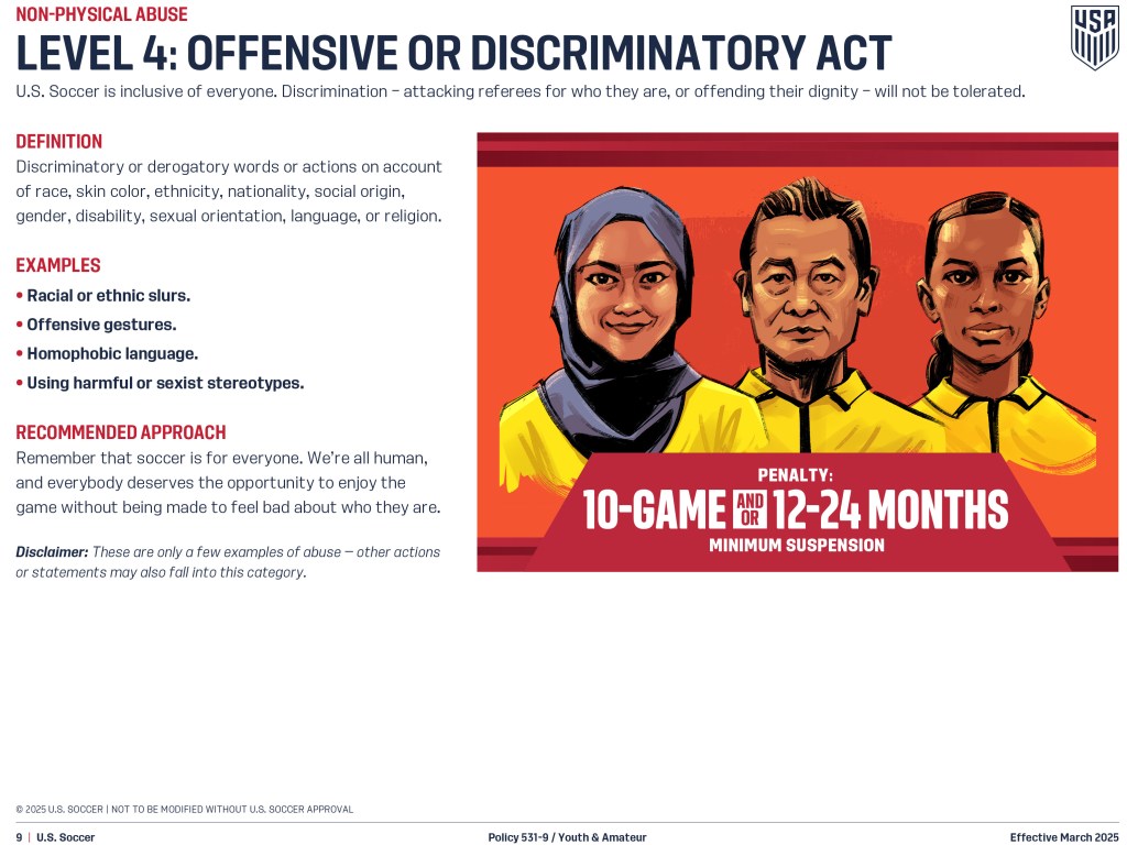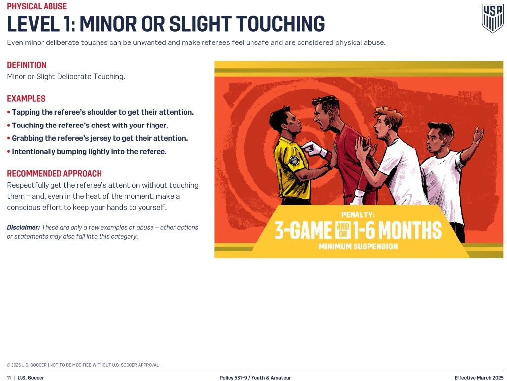 U.S. Soccer is standing firm to protect referees and restore respect to the game. The updated policy includes stronger sanctions for any form of physical or non-physical abuse towards referees. U.S. Soccer encourages every player and coach to learn what behaviors cross the line, so they can avoid penalties and help create a better culture for the future of soccer.
