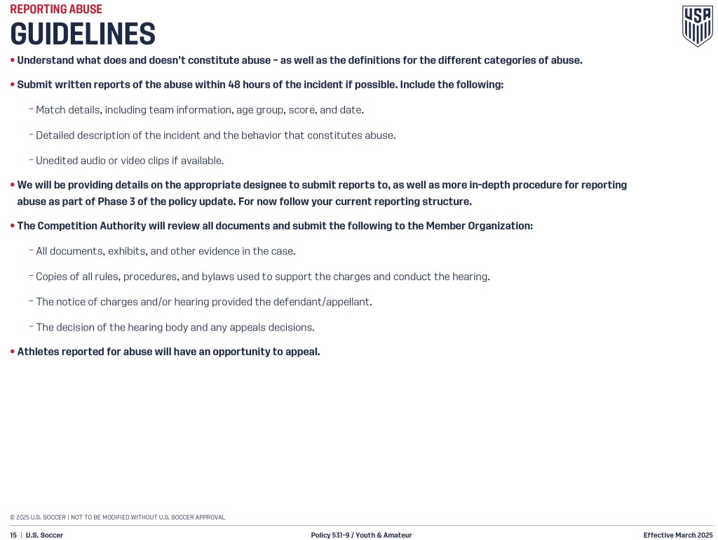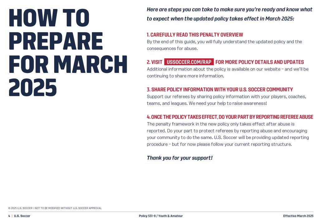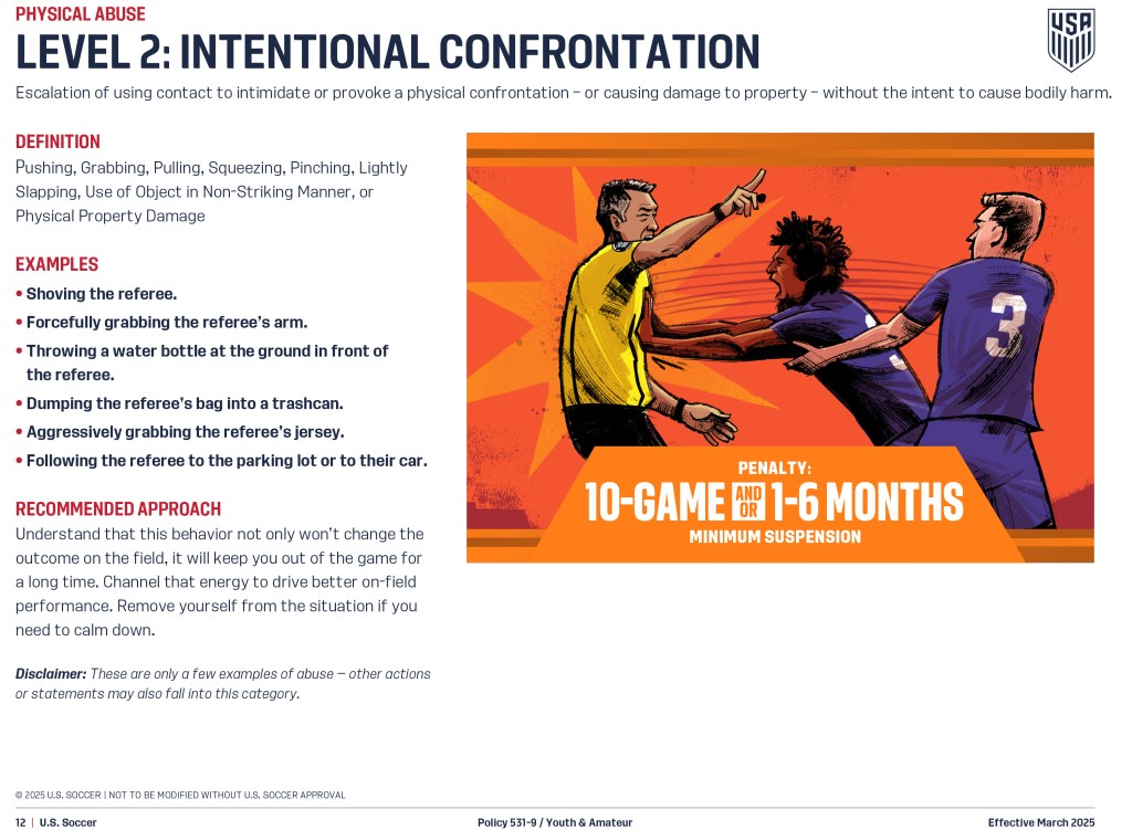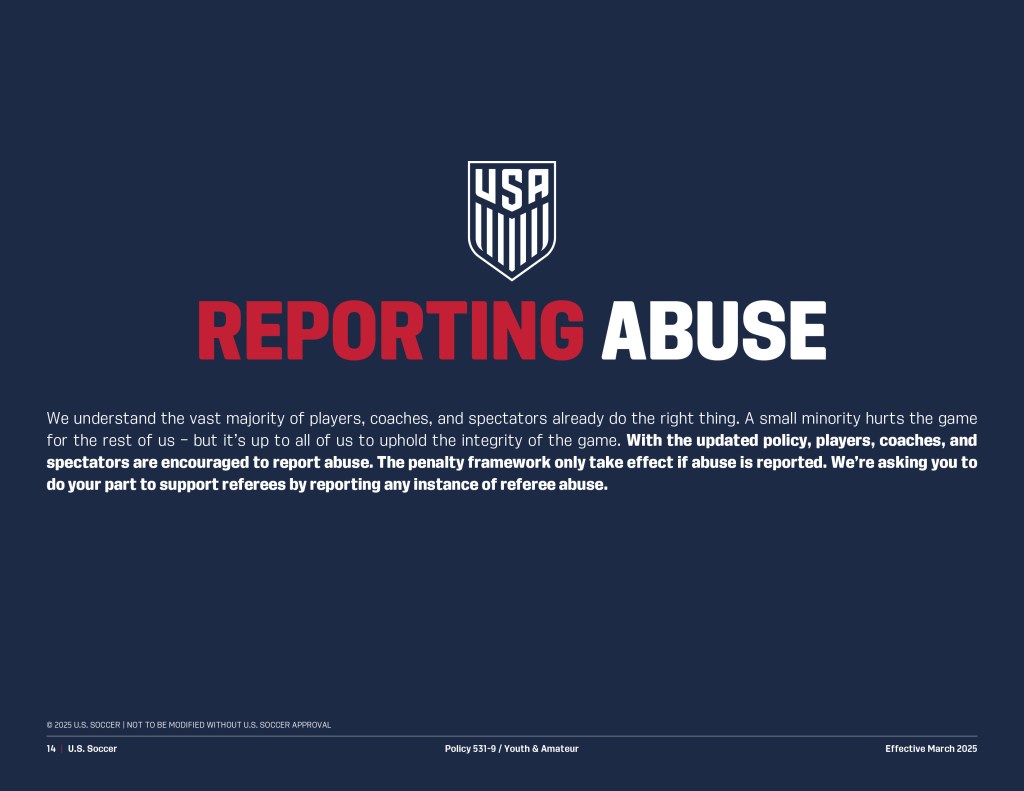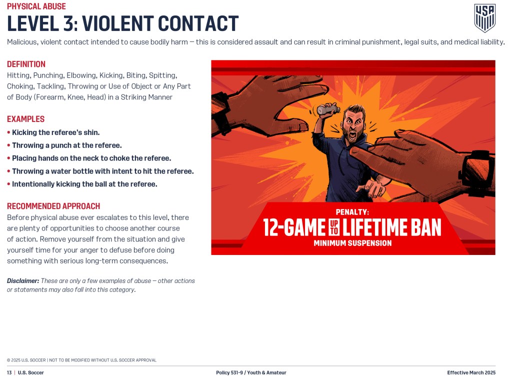 U.S. Soccer is standing firm to protect referees and restore respect to the game. The updated policy includes stronger sanctions for any form of physical or non-physical abuse towards referees. U.S. Soccer encourages every player and coach to learn what behaviors cross the line, so they can avoid penalties and help create a better culture for the future of soccer.