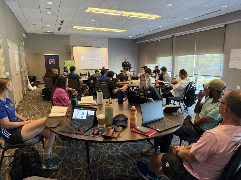 Indiana Soccer recently hosted the U.S. Soccer National C License course at Grand Park in Westfield, IN, bringing together 27 coaches from across the country. Led by Steve Franklin, Indiana Soccer’s Director of Education, and Derek Willis, and Goran Tomic, the course saw a remarkable shift in representation—40% of participants were female coaches, compared to the typical 5% average in coaching education programs.